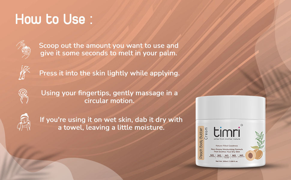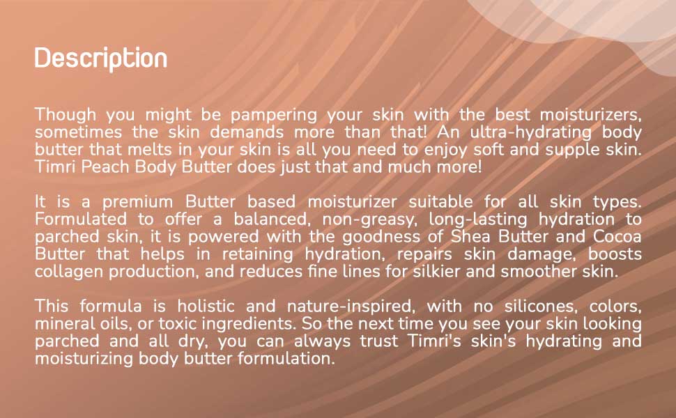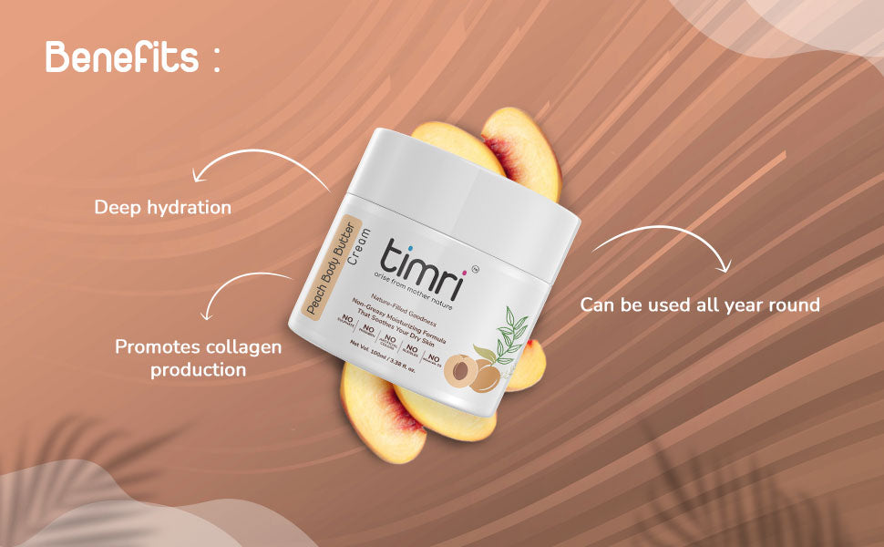 Though you might be pampering your skin with the best moisturizers, sometimes the skin demands more than that! An ultra-hydrating body butter that melts in your skin is all you need to enjoy soft and supple skin. Timri Peach Body Butter does just that and much more!