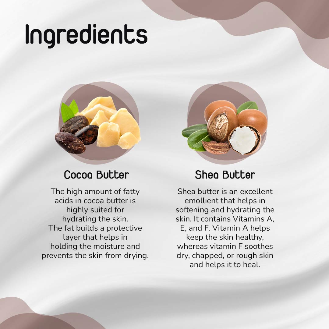 Deeply Nourishes & Moisturizes Skin: The high amount of fatty acids in cocoa butter is highly suited for hydrating the skin. The fat builds a protective layer that helps in holding the moisture and prevents the skin from drying.