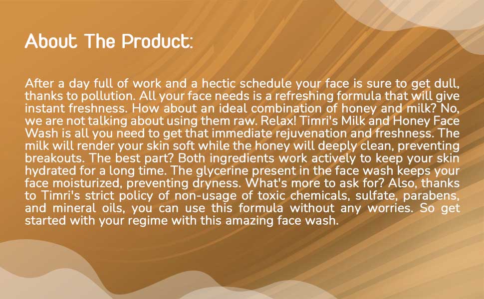 After a day full of work and a hectic schedule your face is sure to get dull, thanks to pollution. All your face needs is a refreshing formula that will give instant freshness. How about an ideal combination of honey and milk? No, we are not talking about using them raw. Relax! Timir’s Milk and Honey Face Wash is all you need to get that immediate rejuvenation and freshness. The milk will render your skin soft while the honey will deeply clean, preventing breakouts. The best part? Both ingredients work actively to keep your skin hydrated for a long time. The glycerin present in the milk face wash keeps your face moisturized, preventing dryness. What is more to ask for? Also, thanks to Timri’s strict policy of non-usage of toxic chemicals, sulfate, parabens, and mineral oils, you can use this formula without any worries. So, get started with your skincare routine with this honey face wash.