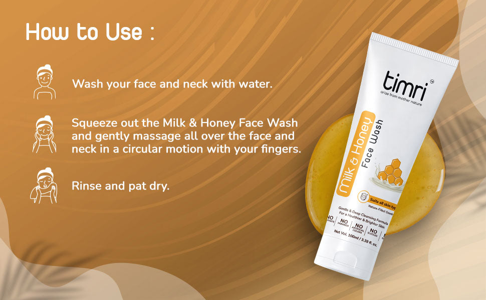 Step 1: Wash your face and neck with water.\n\nStep 2: Squeeze out the Milk & Honey Face Wash and gently massage all over the face and neck in a circular motion with your fingers.\nStep 3: Rinse and pat dry.