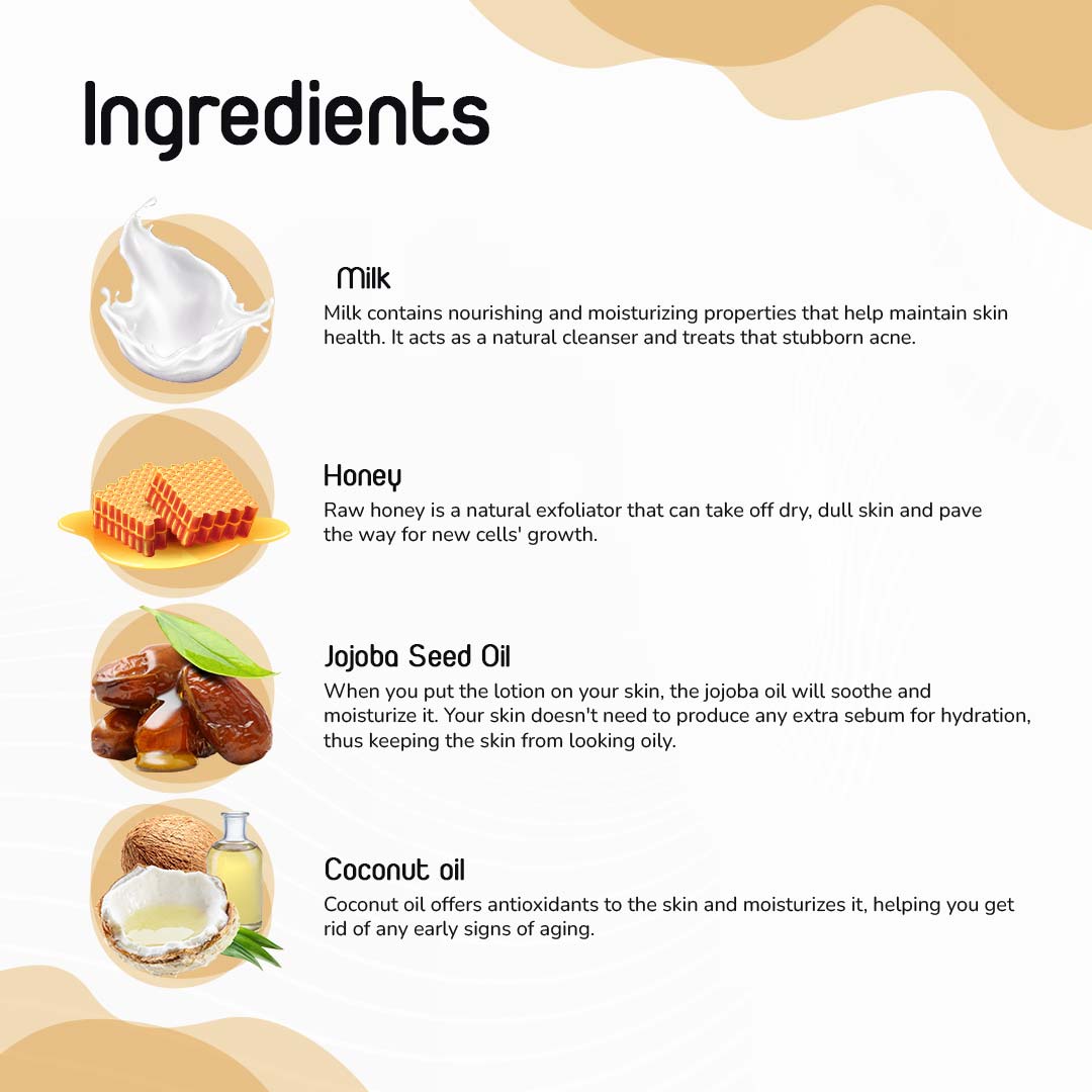 Timri Milk & Honey Lotion is a luxurious blend of naturally sourced milk and honey extracts that finely polishes and nourishes the skin, giving it intense 24-hour hydration. Not just this, it also leaves a sweet and pleasant fragrance in your body that will linger for a long time. Taking multidimensional care of your skin, this formula is sure to give you fresh, clear, and moisturized skin all day long.